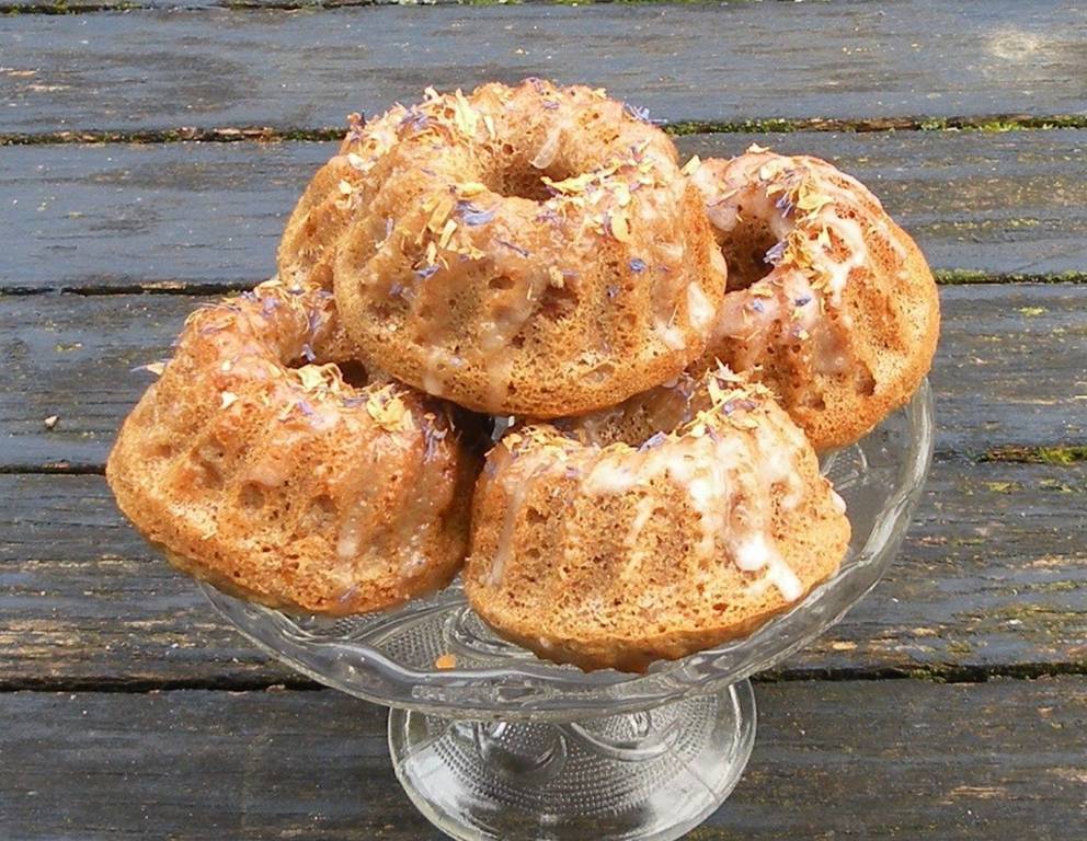 - Bei 160 Grad Heißluft etwa 20 Minuten hell ausbacken, Stäbchenprobe machen! Aus Staubzucker und Limettensaft eine mitteldicke Glasur anrühren und die noch warmen Gugelhupferl damit bestreichen. Am Schluss mit Flower-Power-Gewürzblüten bestreuen.