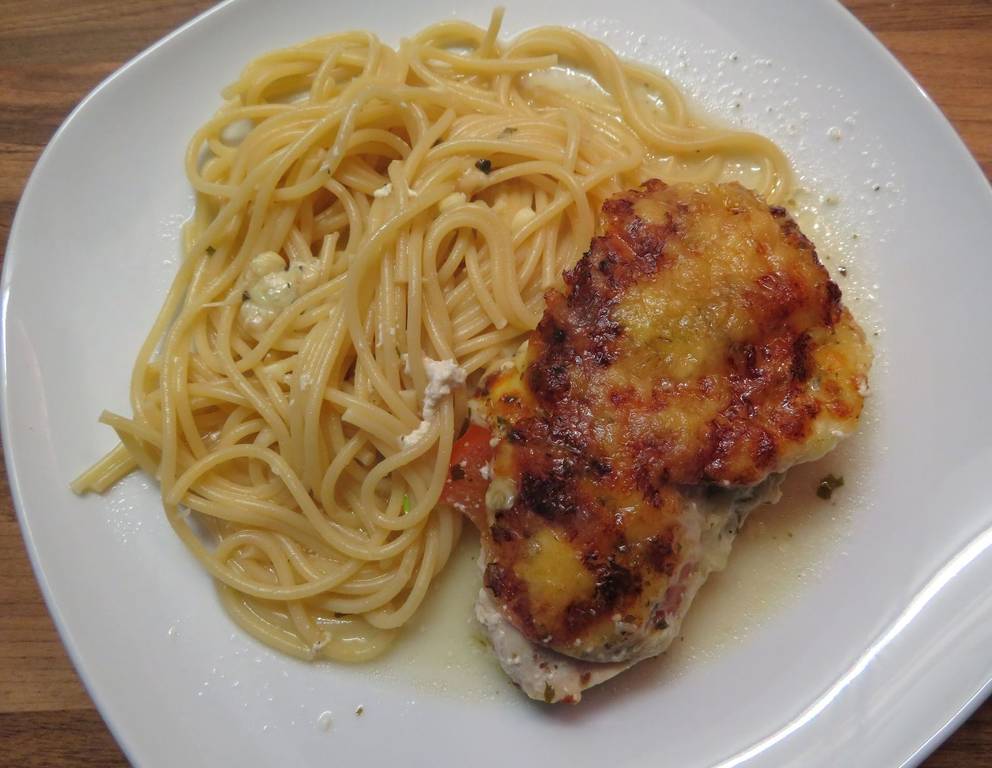 Zu den Hühnerfilets mit Spaghetti passt Blattsalat! Wer möchte, kann auch Pizzakäse oder Parmesan zum Überbacken verwenden.
