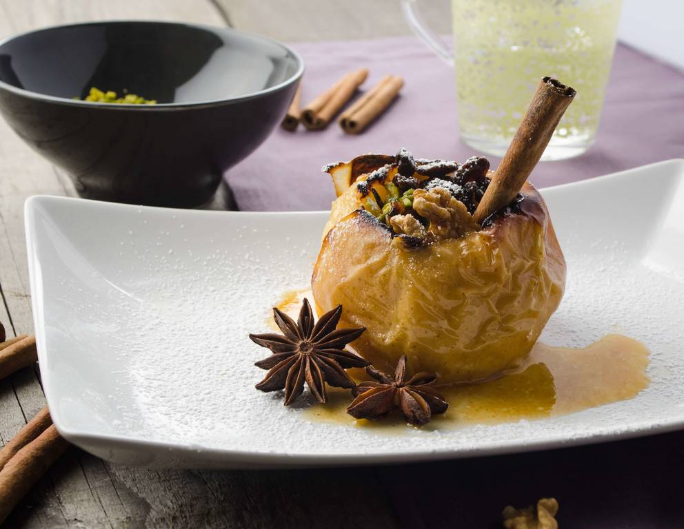 - Den fertig gebackenen Bratapfel mit einer Zimtstange und Walnüssen garnieren.
