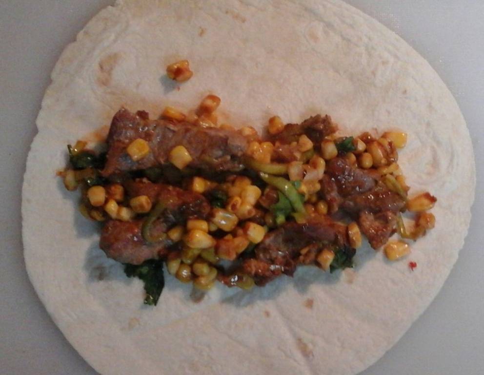 Der Wrap mit Steak kann zusätzlich mit geriebenem Emmentaler oder Gouda gefüllt werden. Statt Schweinefleisch ist natürlich auch Rindfleisch geeignet.