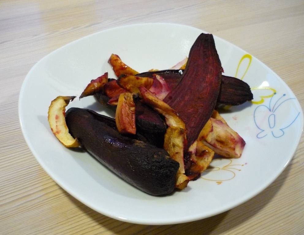 - Eine Auflaufform mit Olivenöl beträufeln und mit etwas Salz betreuen. Die Roten Rüben Hälften mit der Chnittfläche nach unten in die Auflaufform legen, die Äpfel rundherum verteilen.