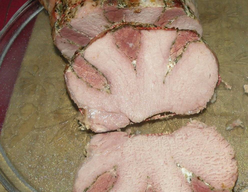 - In die Schnitte eine Mischung aus Salz, Pfeffer und Schweinsbratengewürz fest einreiben. Anschließend zuerst die Käsescheiben, dann die Geselchtes Scheiben in die Schnitte im Braten legen.