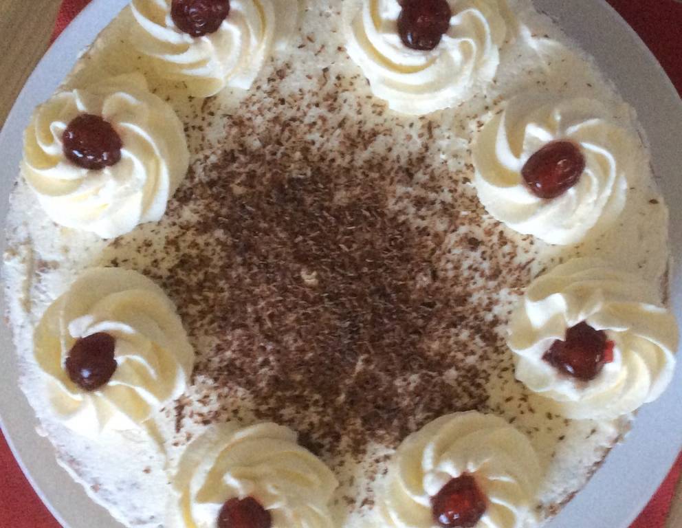 - Die Torte rundum mit Schlagobers bestreichen, mit Schokospänen bestreuen, Rosetten aufspritzen und mit Cocktailkirschen dekorieren.