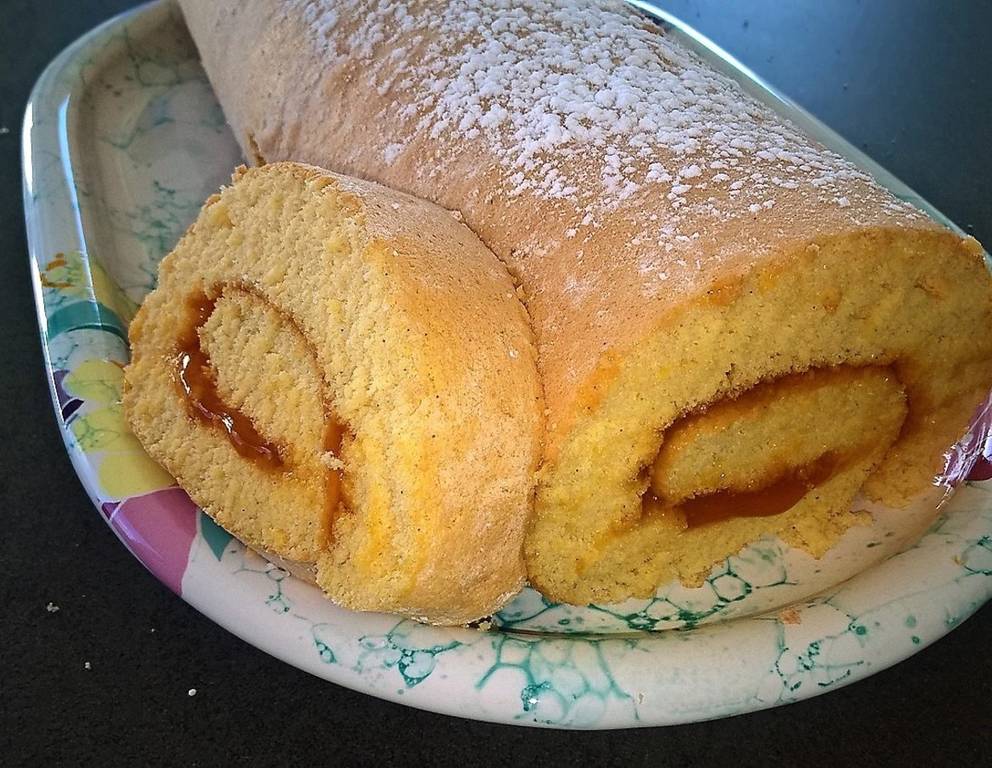 - Auf ein mit Zucker bestreutes Geschirrtuch mit der Oberseite nach unten stürzen. Das Papier befeuchten, damit es sich besser abziehen lässt, mit Marmelade bestreichen und mit Hilfe des Geschirrtuchs einrollen.