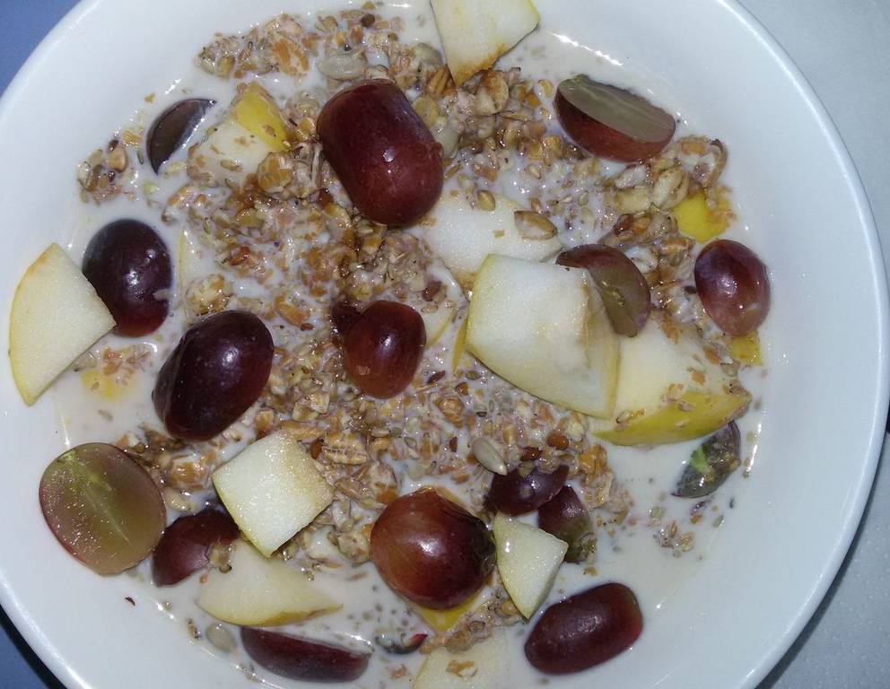 - Den Apfel in Stücke schneiden und die Weintrauben halbieren. Joghurt mit Honig verrühren und mit dem lauwarmen Müsli und den Früchten mischen.