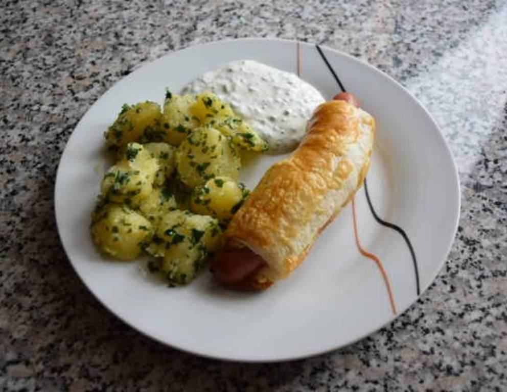Wer mehr Zeit hat, macht die Würstel im Schlafrock mit selbst gemachtem Blätterteig. Sehr gut passt auch Krautsalat dazu. Etwas Pfeffer in der Schnittlauchsauce sorgt für angenehm leicht scharfe Note.