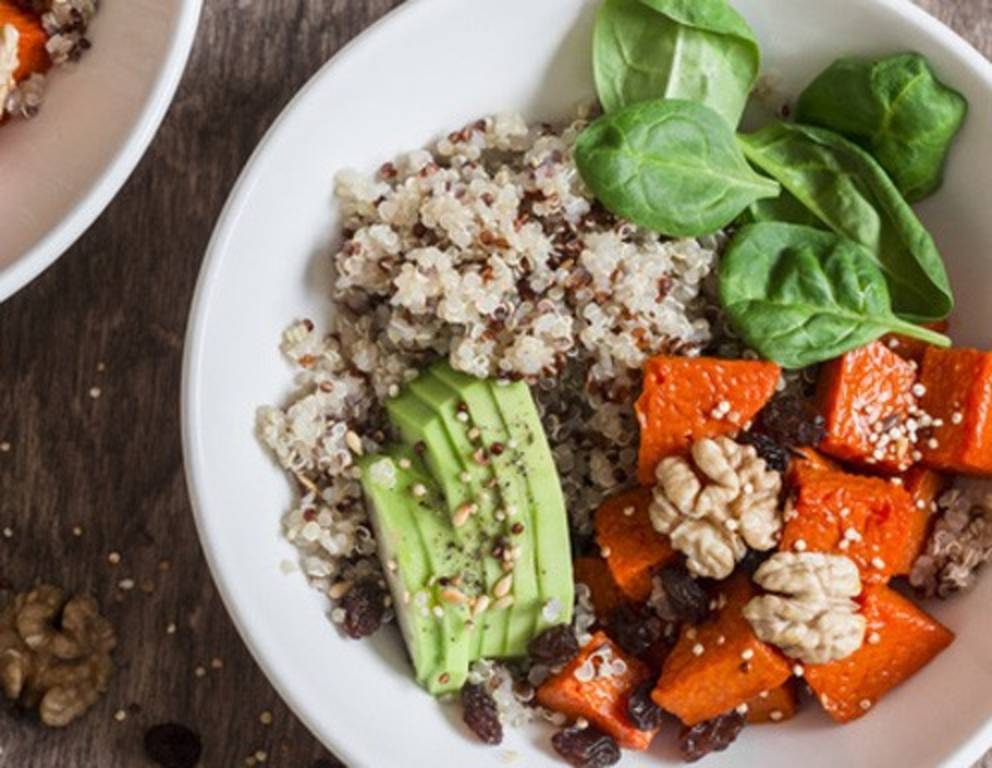 - Vogerlsalat in eine Schüssel geben, den Quinoa, Avocado, Spinatblätter und den Kürbis darauf verteilen.