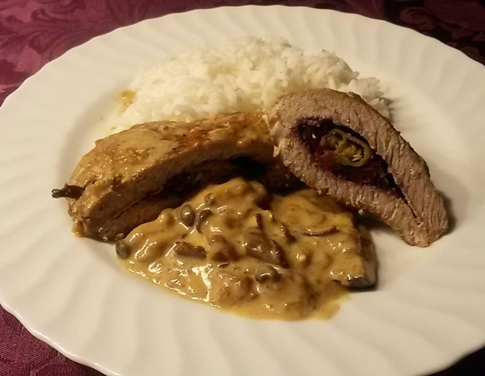 - Fleisch klopfen, salzen, pfeffern und mit Senf bestreichen, mit Karottenstreifen und Ölpfefferoni belegen und zusammen klappen. Mit einer Rouladennadel fixieren.
