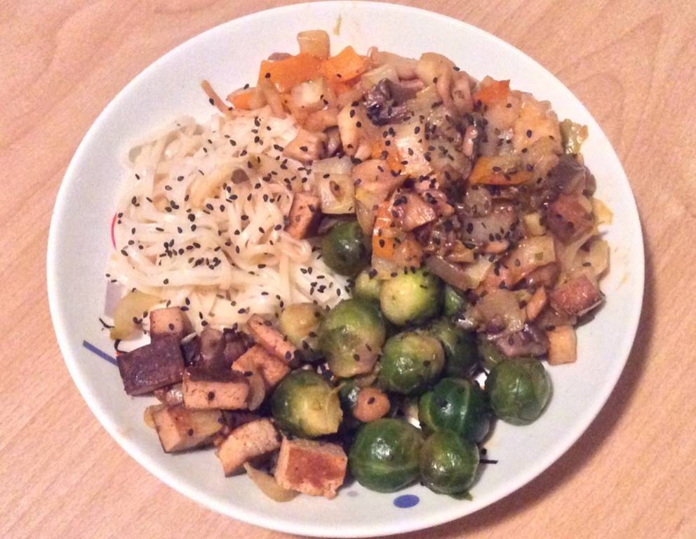 - Für die Veggie Buddha Bowl die Nudeln in heißem Wasser kochen. Währenddessen den Räuchertofu würfeln und in Woköl anbraten.