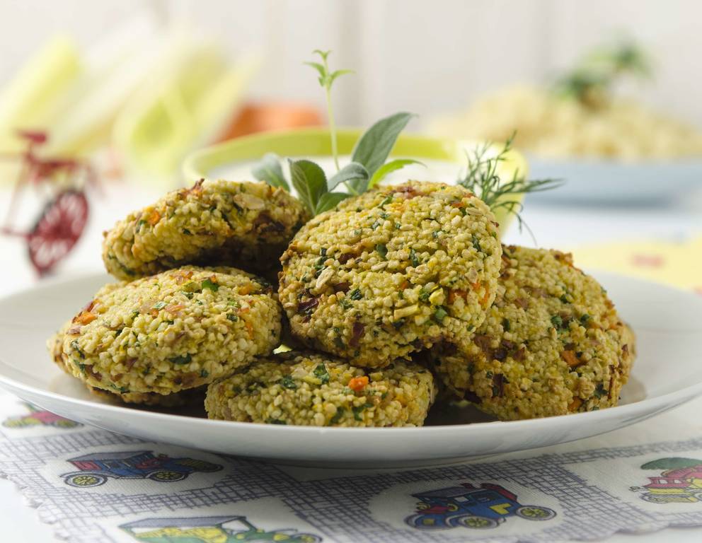 - Schinken in feine Würfel schneiden, Karotte schälen und fein reiben. Jungzwiebel putzen und in feine Ringe schneiden. Mit den Haferflocken, den gehackten Kräutern, dem Ei sowie den Gewürzen unter den etwas abgekühlten Couscous mischen.