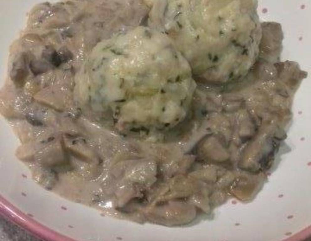 - Zuletzt die Sauce eventuell mit etwas Mehl binden. Die fertigen Knödel (wenn die im Wasser obenauf schwimmen) abseihen und in der heißen Sauce servieren.