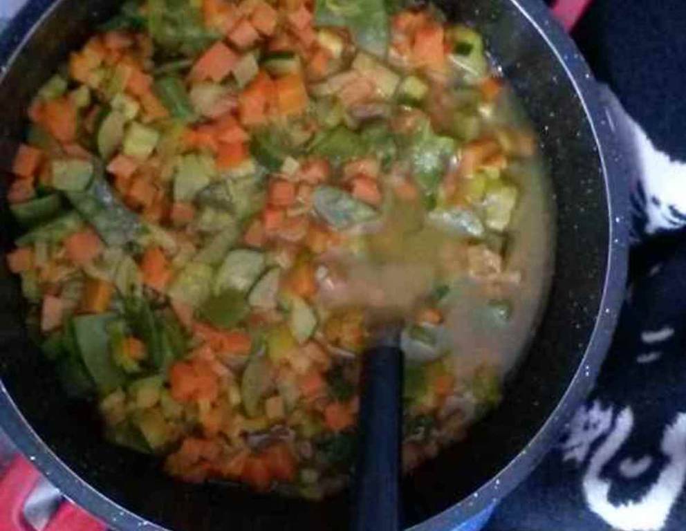 - Für die scharfe Curry-Gemüse-Suppe das ganze Gemüse klein schneiden. Das Olivenöl in einem Topf erhitzen und das Gemüse darin anbraten. Nach einigen Minuten das Currypulver und den Cayennepfeffer kurz mitrösten und dann mit der Gemüsesuppe aufgießen.