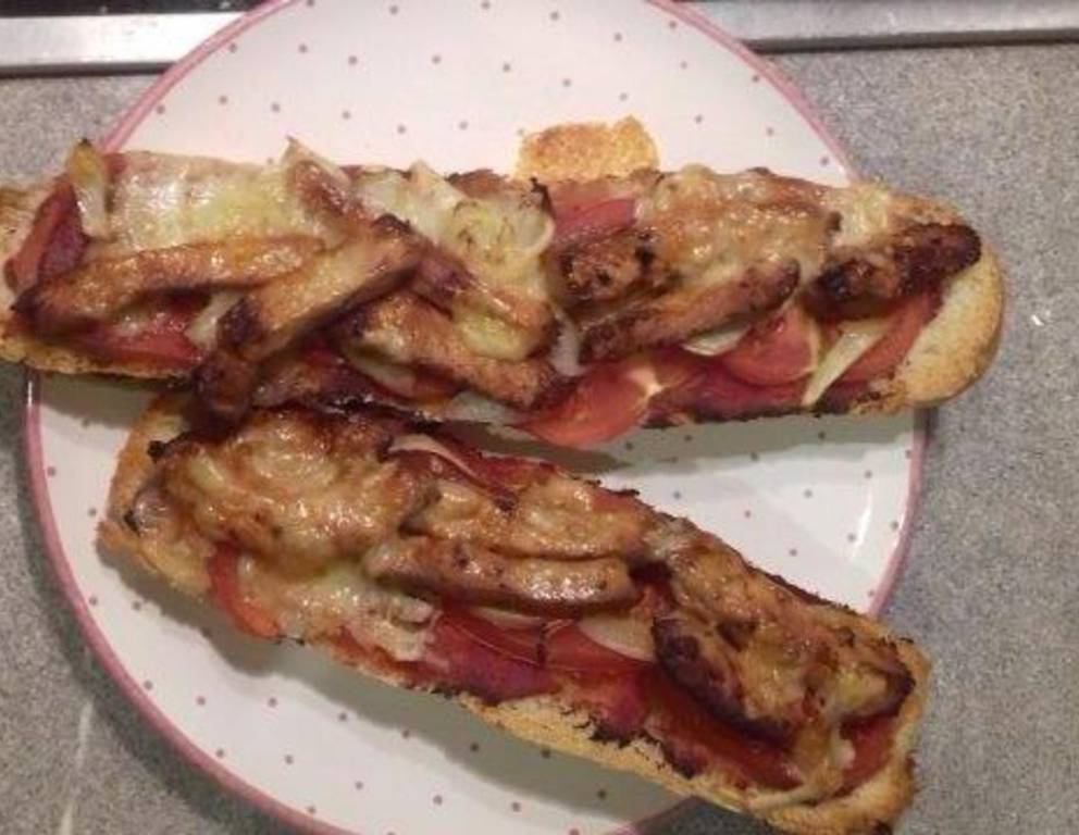 - Das Baguette aufschneiden und die Flächen mit Tomatenmark bestreichen. Darauf Tomatenscheiben legen, darauf die Zwiebelscheiben. Am Schluss die Steakstreifen auf die Zwiebelscheiben geben und den Käse über das Fleisch geben.