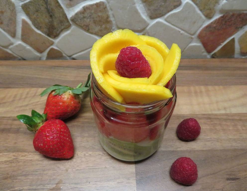 - Nun seitlich die Erdbeerblättchen ans Glas drücken und mit den restlichen Erdbeeren, 3 Himbeeren und dem übrigen Joghurt auffüllen. Nun die Mangostreifen zu einer Blume zusammendrehen und darauf setzen.