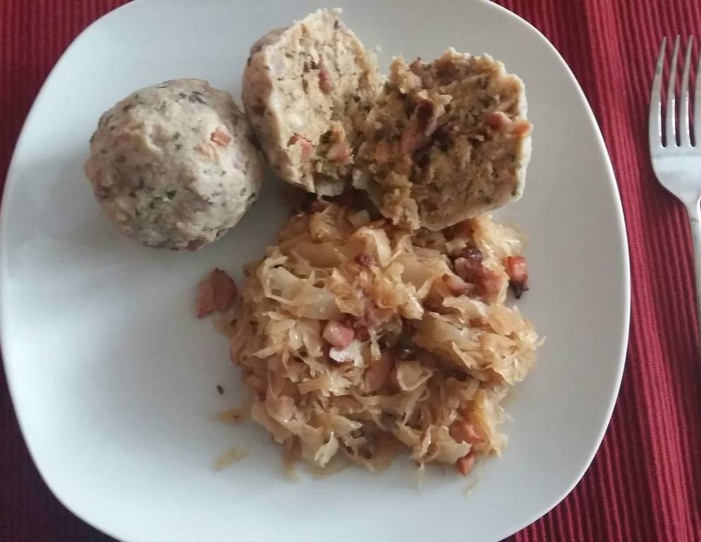 - Knödel formen, in siedendes Wasser legen und ca. 20 Minuten kochen. Das Kraut kochen und ebenfalls Speck darunter mischen.