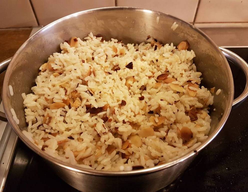 Den Reis mit Mandelblättchen mit frischen Kräutern nach Wahl verfeinern. Butter statt der Margarine gibt einen feineren Geschmack.