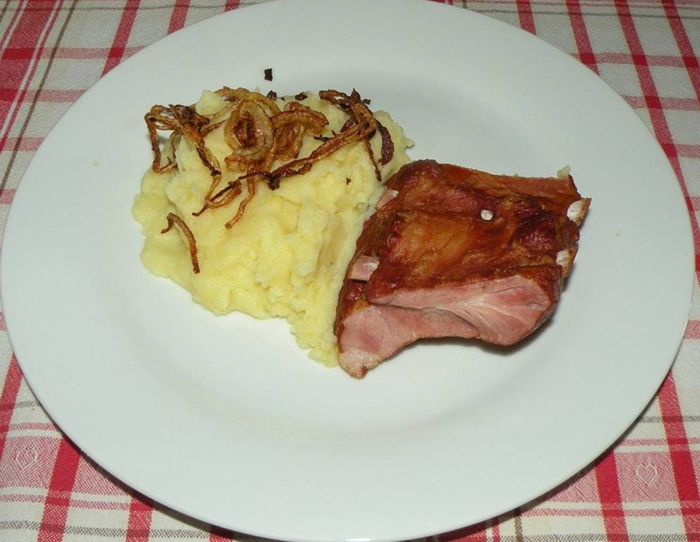- Das Püree auf Tellern anrichten, mit Zwiebeln belegen und zusammen mit den Ripperln servieren.