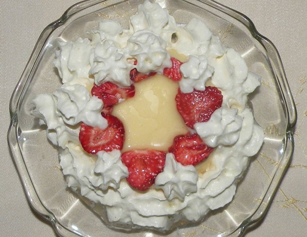 - Mit halbierten Erdbeeren und mit halbsteif geschlagenem Schlagobers garnieren.