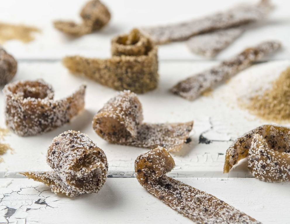 - Dann die Kiwi-Bänder in ca. 1/2 cm dicke Streifen schneiden, in Zucker wälzen und einrollen.