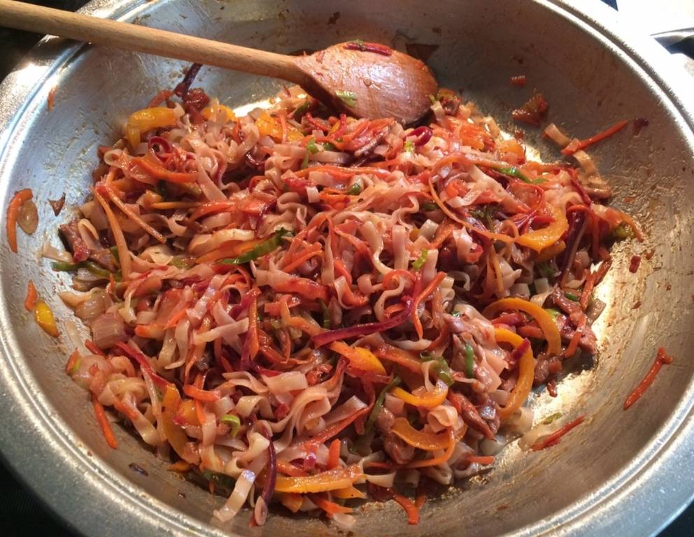 - Zuerst Karotten zugeben und etwas rösten lassen, danach die restlichen Zutaten, mit den Gewürzen pikant abschmecken, Nudeln beimengen und gut miteinander vermischen, sofort servieren.