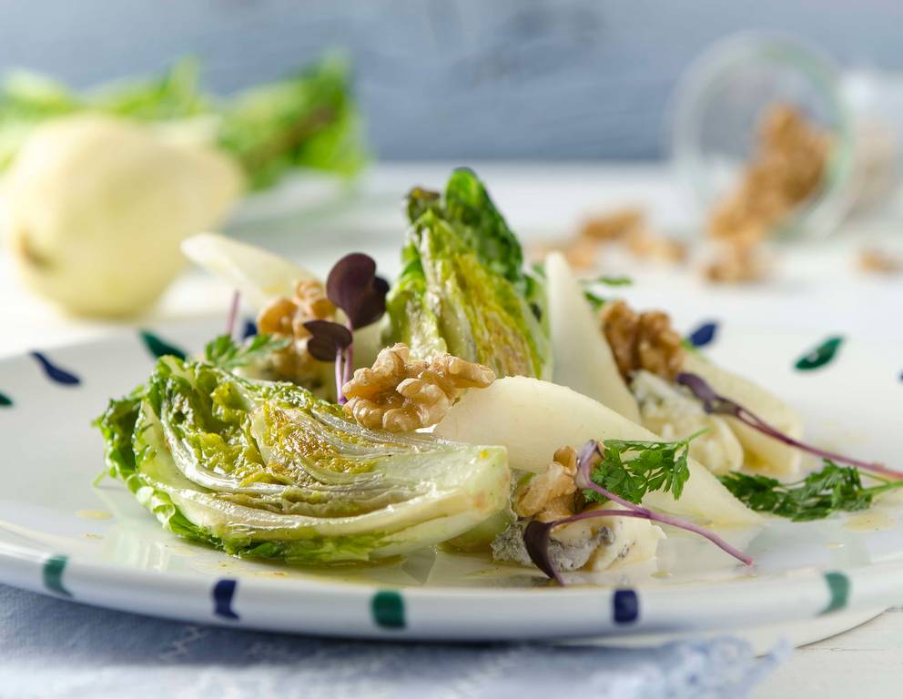 - Salatherzen, Birnen und Dolcelatte auf einem Teller anrichten, mit Dressing beträufeln und die Salatherzen mit Birnen, Dolcelatte und Senf-Vinaigrette mit frischem Kerbel und den Walnusskernen bestreuen.