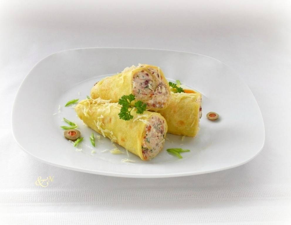 - Jeweils eine Palatschinke mit Schafskäse-Füllung bestreichen und locker einrollen. Die gefüllten Palatschinken auf Portionstellern anrichten und mit geriebenem Käse bestreuen.