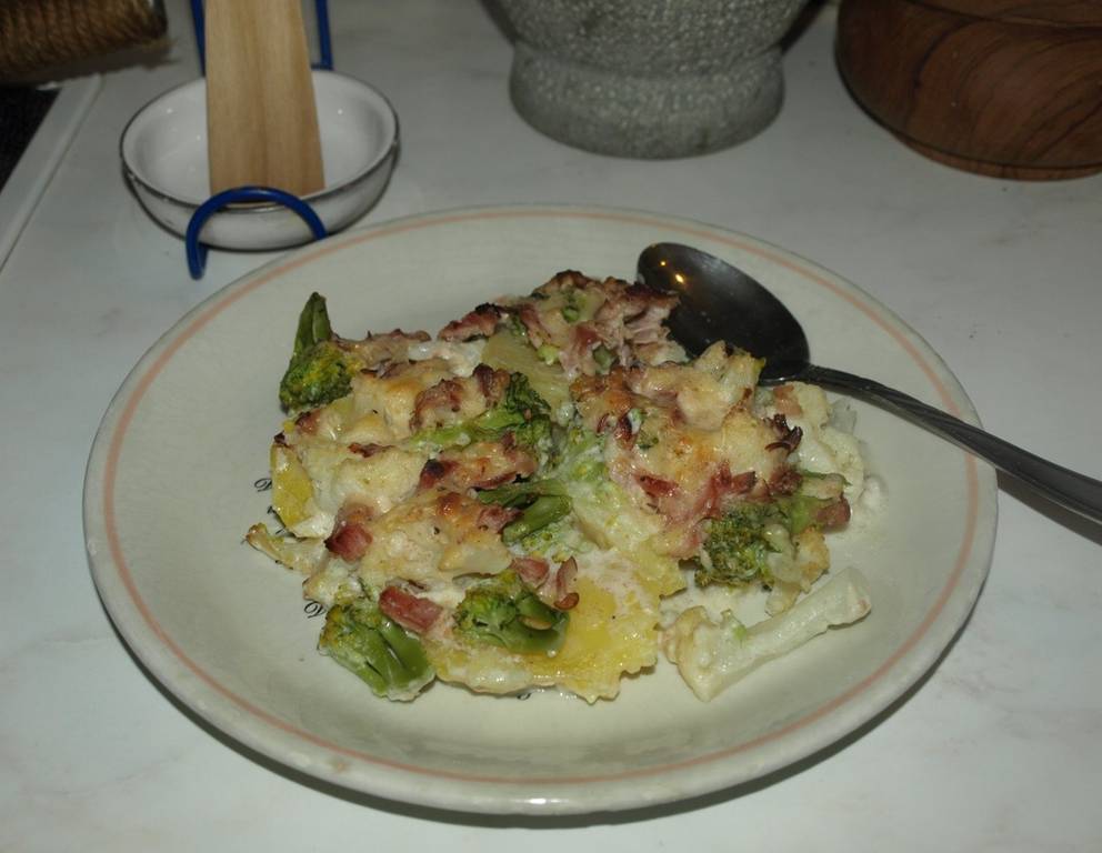 - Für den Brokkoli-Karfiol Auflauf Brokkoli und Karfiol in Röschen teilen, waschen, die Erdäpfel schälen, in Scheiben schneiden und alles in Salzwasser bissfest kochen.