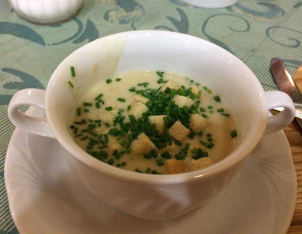 - Suppe aufgießen und Kartoffeln zugeben. Etwa 25 min sanft kochen lassen, dann pürieren. Dotter mit dem Schlagobers verquirlen und in die nicht mehr kochende Suppe geben. Mit Salz, Pfeffer und Muskat würzen.