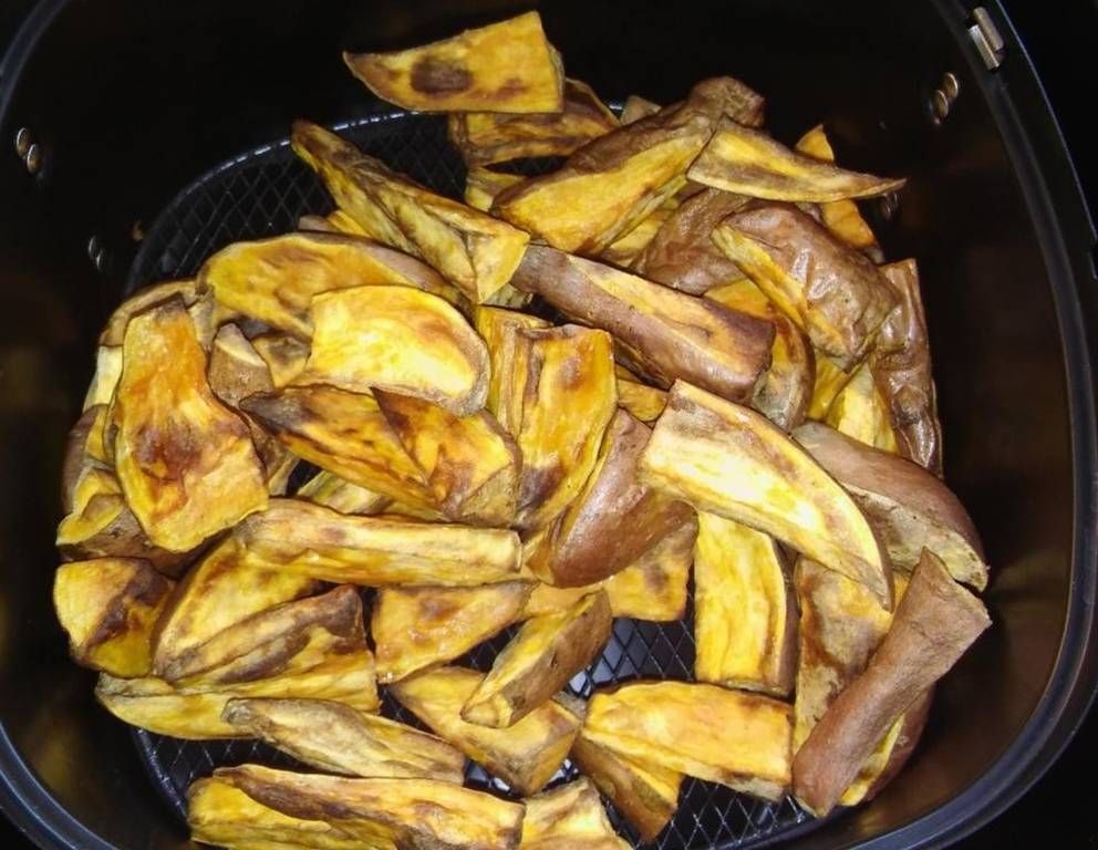 - Mit dem Öl vermischen in den Korb einschlichten und bei 200 °C ca. 20 Minuten im Airfryer zubereiten. Nach 10 Minuten die Wedges gut durchschütteln. Nach Geschmack mit Salz bestreuen.