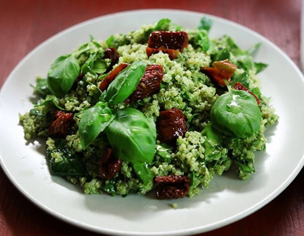 Den Quinoa mit Basilikum-Pesto kann kalt oder leicht erwärmt gegessen werden (1 Stunde bei 60 °C erwärmen im Dörrgerät oder im Backrohr)