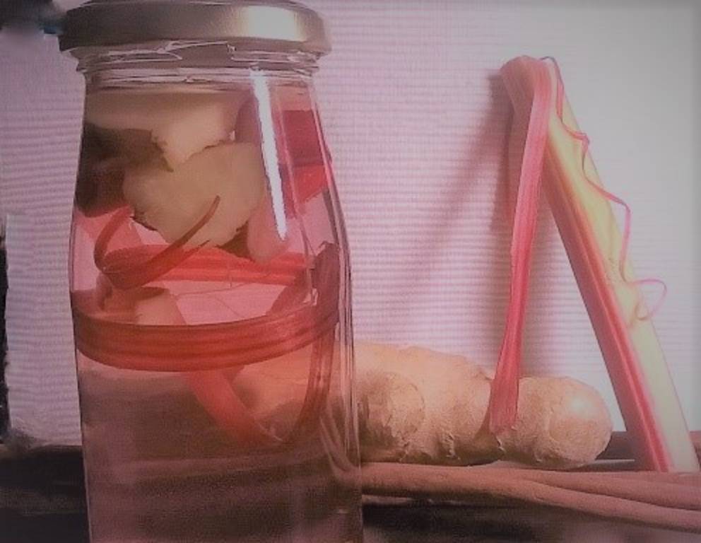 - Das Wasser zusammen mit dem Ingwer und der zerbrochenen Zimtstange in einen Topf (kein Alutopf) geben und aufkochen. Die Rhabarbermischung dazugeben.