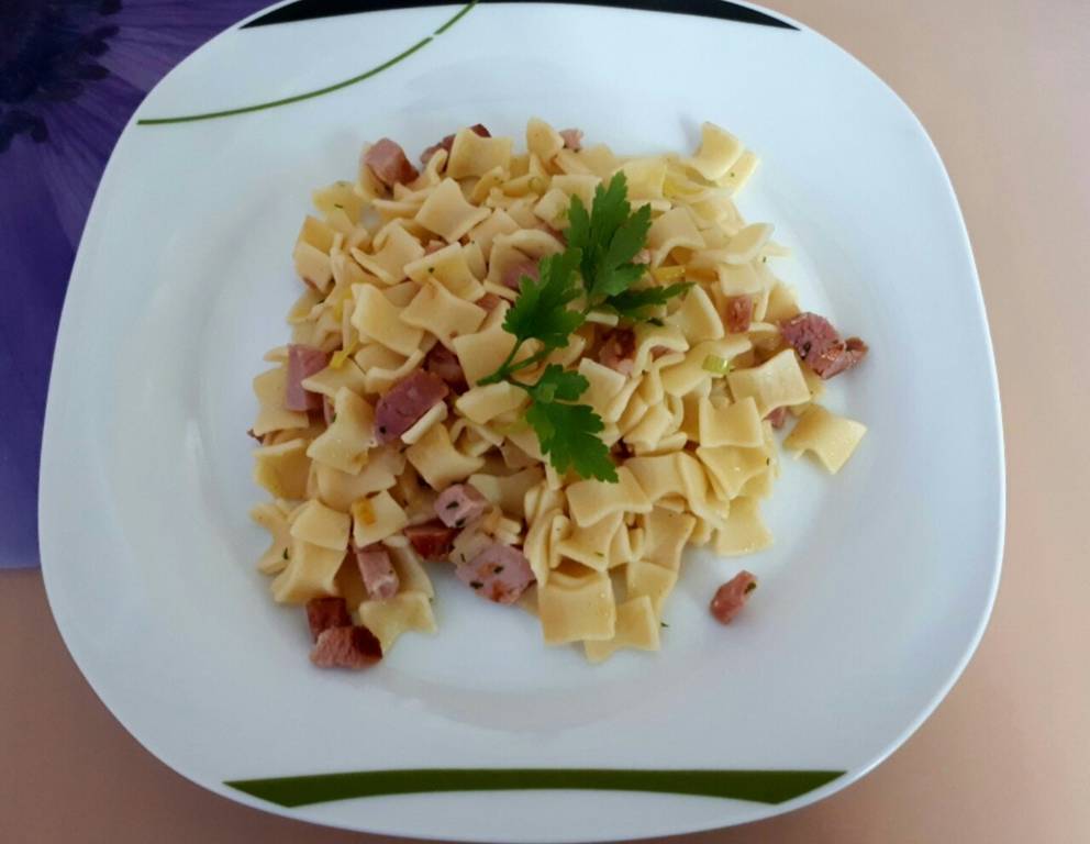 Die Schinkenfleckerln mit grünen Salat servieren.