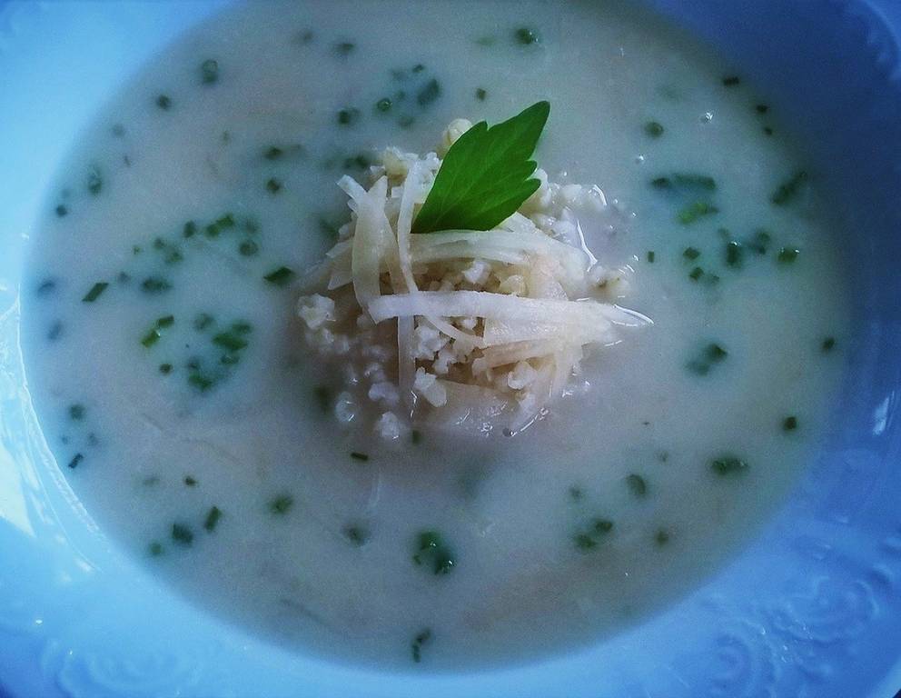 Die Selleriesuppe mit gekochtem Bulgur serviert, ist angenehm sättigend und reichhaltig.