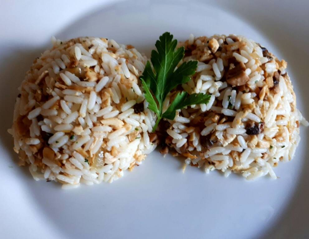 - Für den Hühnerreis mit Champignons Reis mit doppelter Menge Wasser kochen. Reste vom Brat- oder Grillhendl (ca. 150 g) klein, Champignons und Zwiebel kleinwürfelig und Petersilie fein schneiden.