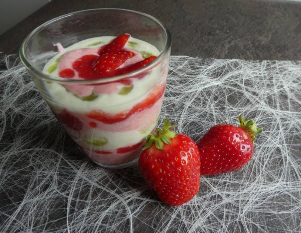 - Dessertgläser vorbereiten. Erst etwas Erdbeerjoghurt, dann Erdbeermus, dann Melonenjoghurt und dann Melonenmus hineingeben. Immer wieder abwechseln. Erdbeer-Melonendessert kühl stellen.