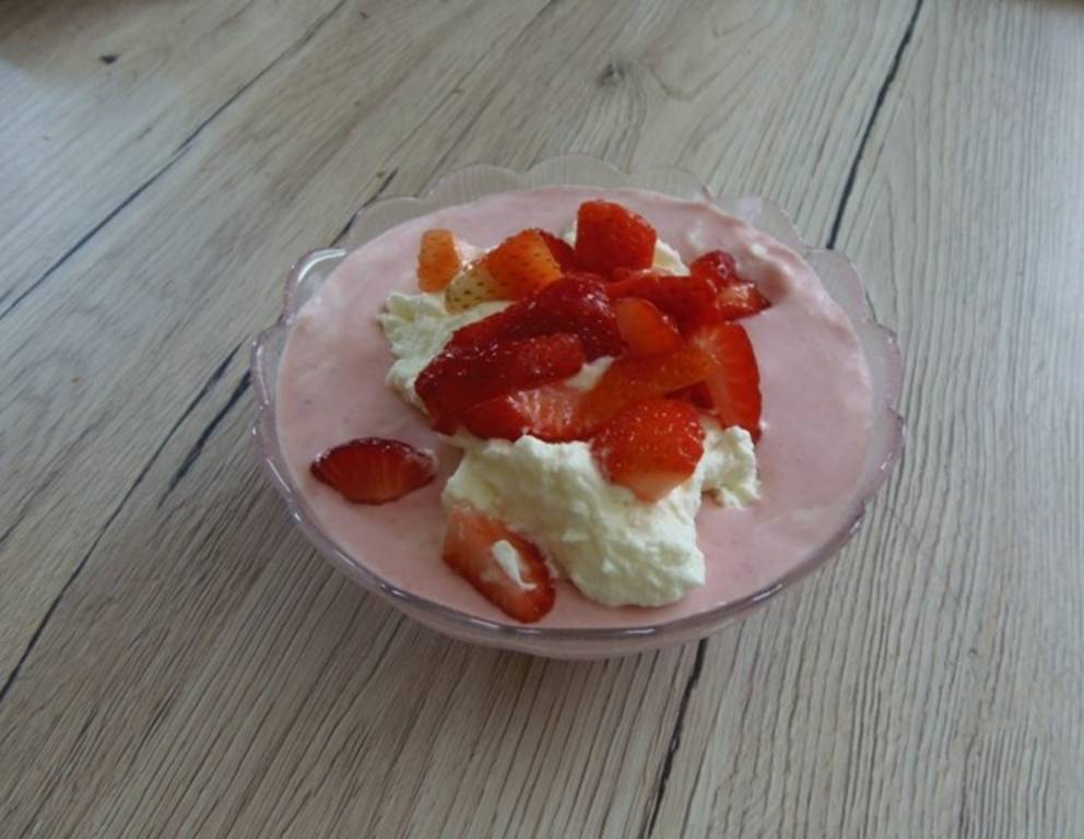 - Die Creme in Schüsseln füllen, restliches Schlagobers und die restlichen Erdbeeren darauf verteilen.