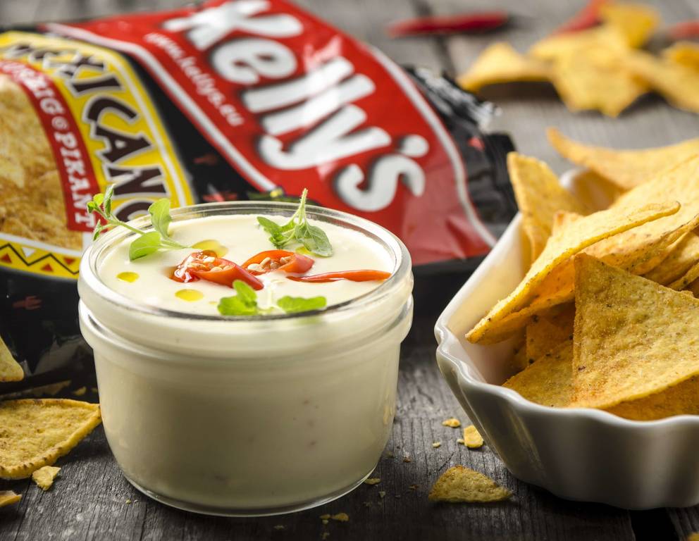 - Den Chili-Käse-Dip nach Belieben abschmecken, mit Gewürzen nach Wahl verfeinern und mit den Tortilla-Chips servieren.