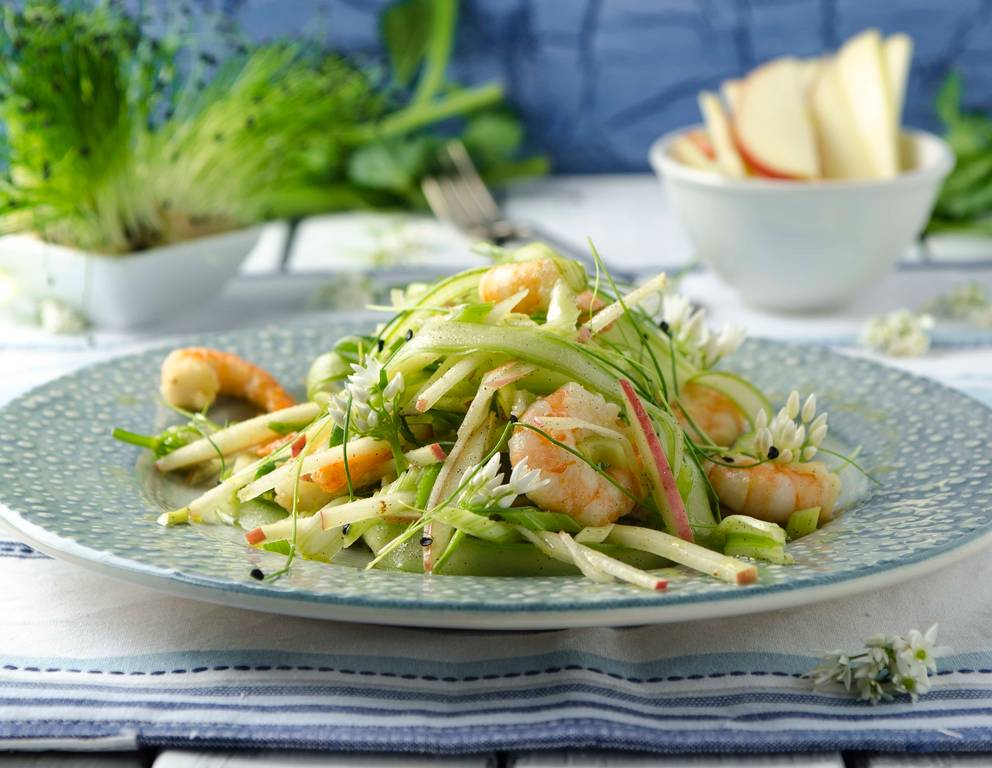 - Stangensellerie und Apfelstifte mit dem Dressing gut abschmecken. Locker auf einem Teller arrangieren, die Garnelen darauf und daneben verteilen und mit Knoblauchsprossen und Schnittlauchblüten garnieren. Apfel-Stangenselleriesalat mit Garnelen mit etwas Dressing beträufeln.