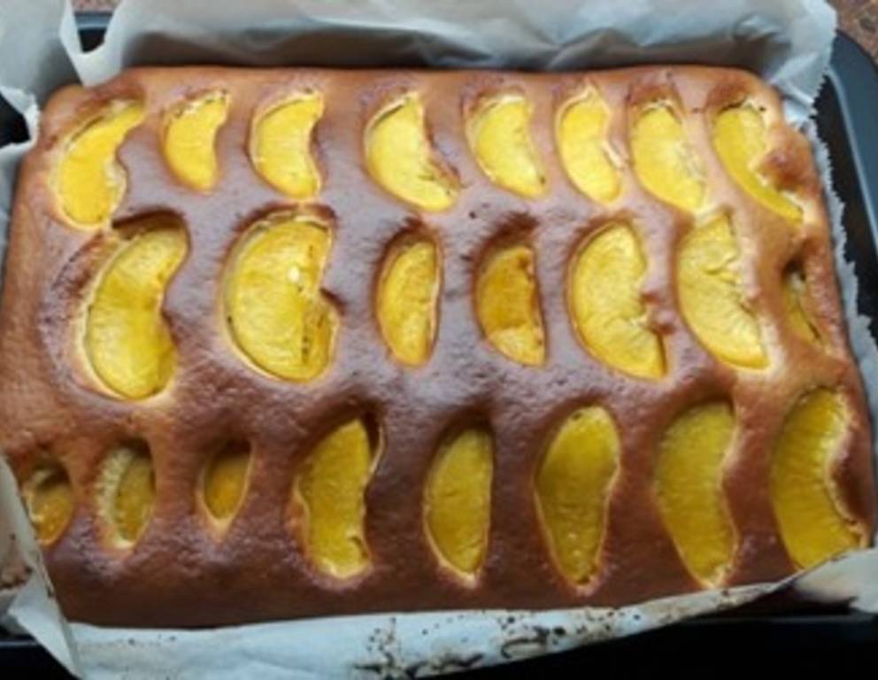 - Trockene Zutaten miteinander vermischen und unter die Masse heben. Den Teig in ein Backblech geben, glatt streichen und mit den Pfirsichhälften belegen. Im vorgeheiztem Backofen bei 180 °C ca. 30 Minuten backen.