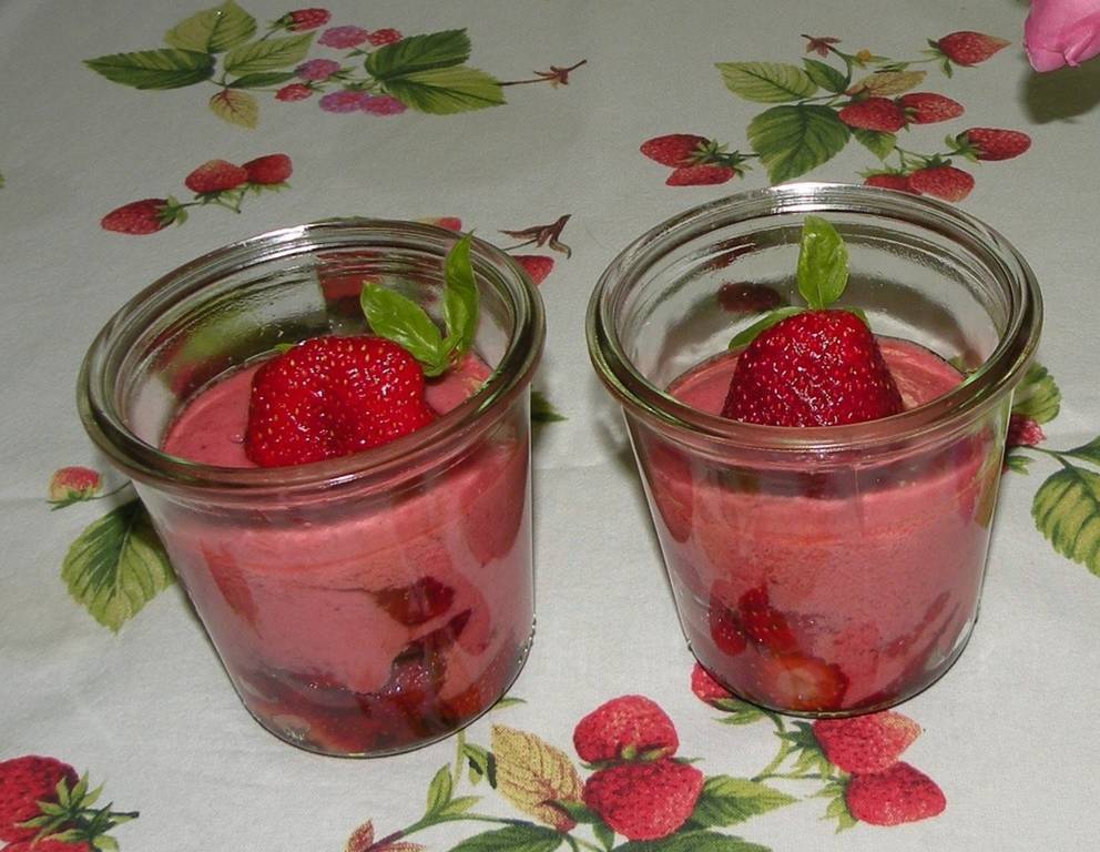 - Qimiq und Mascarpone verrühren. Erdbeerpüree mit der Mascarponecreme mischen. Marinierte Erdbeerstücke auf vier Dessertgläser verteilen, Creme darüber geben und mit Erdbeeren und Basilikum garniert kalt stellen.