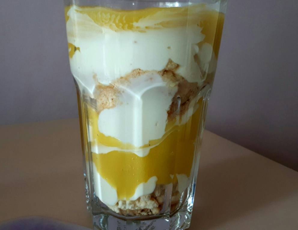 - Die 4 Biskotten in ein Gefriersackerl geben und zerdrücken. Anschließend abwechselnd die Biskottenbröseln, die Creme und das Mangopüree in ein Glasgefäß füllen bis alles aufgebraucht ist.