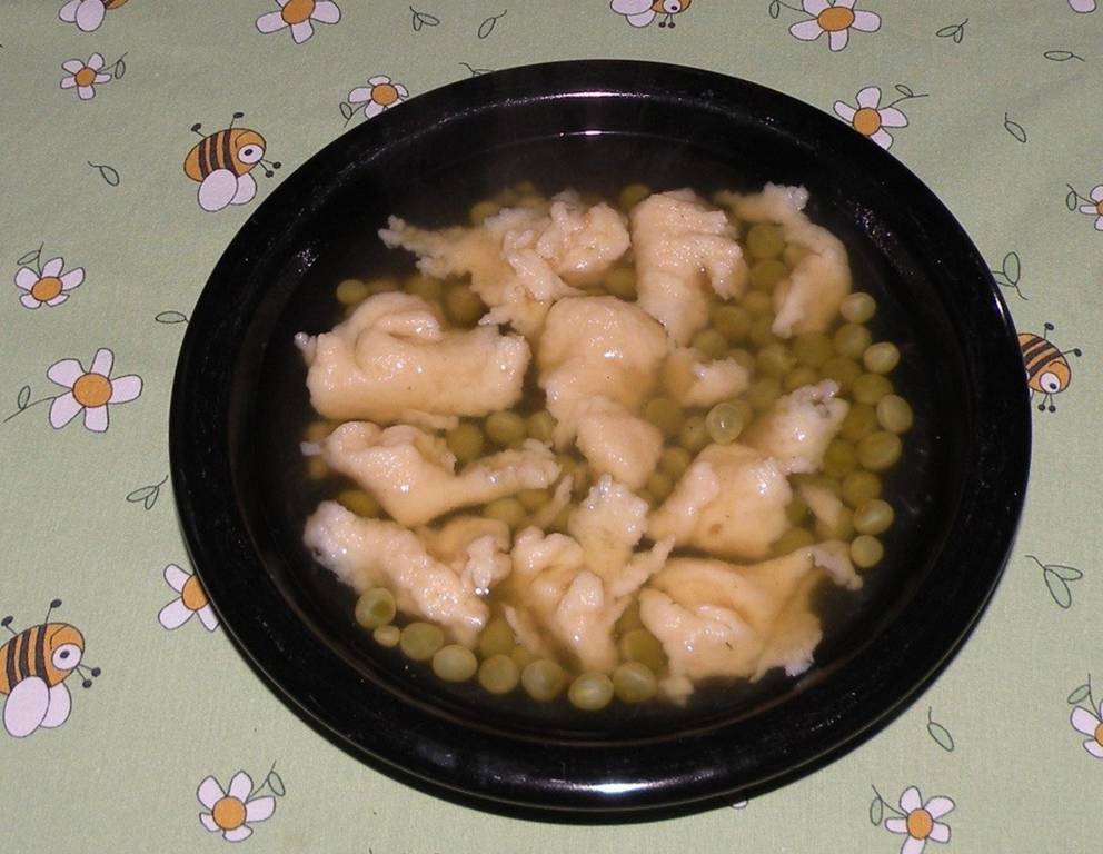 - Die Suppe abseihen, die Schoten gut ausdrücken und die Erbsen in dieser Suppe aufkochen. Zum Schluss Butternockerl und einen Löffel Butter in die Suppe geben und servieren.