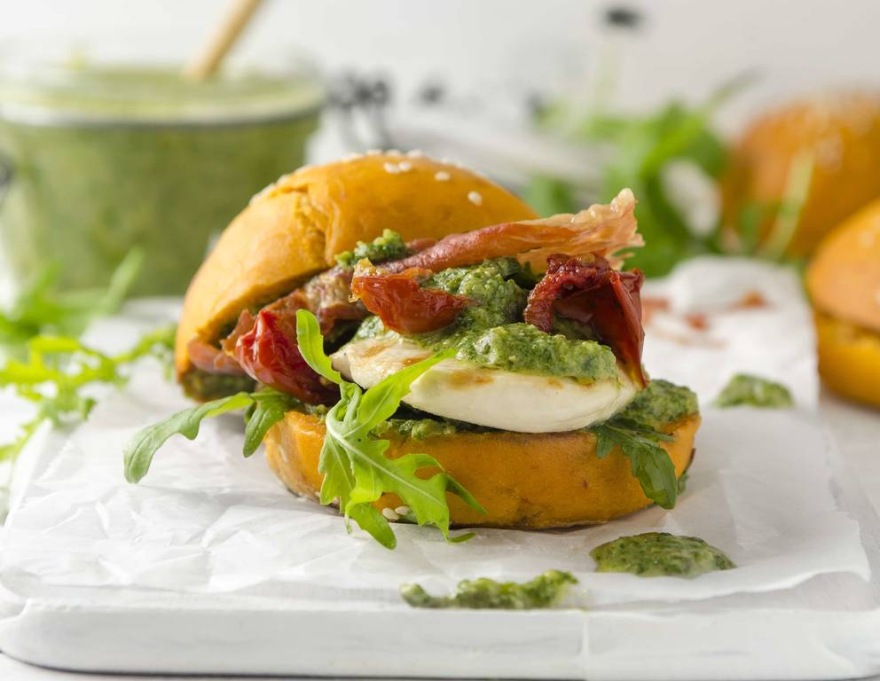 Als Beilage zum Chickenburger mit knusprigem Prosciutto und Salsa Verde eignen sich z.B. Pull-Apart-Pommes!