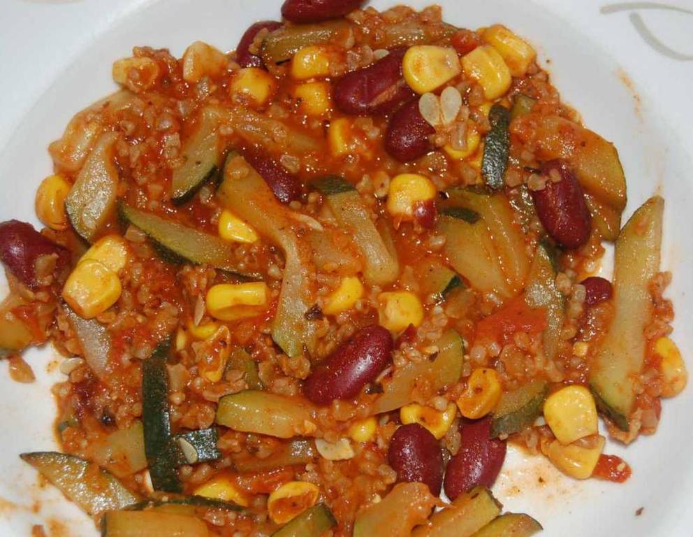 - Zucchini und Paprika hineingeben und ca. 5 Minuten andünsten. Tomaten, samt den Saft aus der Dose, sowie abgetropfte Kidneybohnen und den Mais ebenfalls mit in die Pfanne geben.