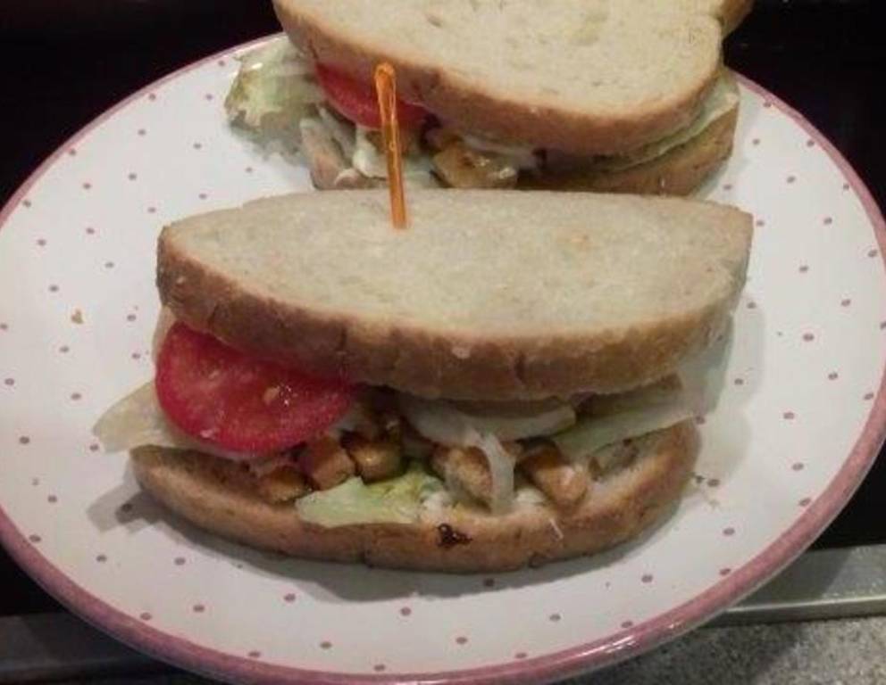 - Auf den Salat einige Fleischwürfel, dann Tomaten- und Zwiebelscheiben legen. Mit etwas Ketchup, Mayonnaise oder Senf betupfen und die andere Brotscheibe darauflegen.