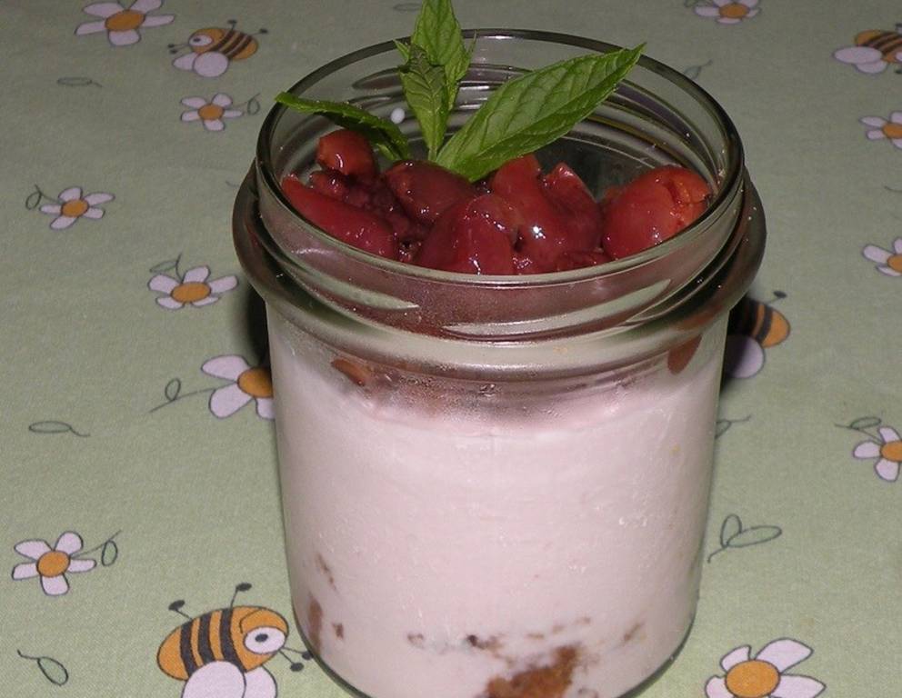 - In vier Sturzgläsern den Boden mit jeweils einer Scheibe Schokokuchen auslegen. Mit jeweils 2 cl Schnaps beträufeln. Joghurtmischung darüber leeren und im Gefrierschrank etwa 2 Stunden frieren, mit den Amarenakirschen dekoriert servieren.