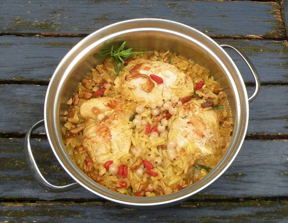 - Dann den Reis dazugeben, gut durchrühren, mit etwa 250 ml  Wasser aufgießen. Gehackte Nüsse, getrocknete Gojibeeren, Rosinen und das Currypulver, gehackte Minze, sowie Salz nach Geschmack hinzufügen.
