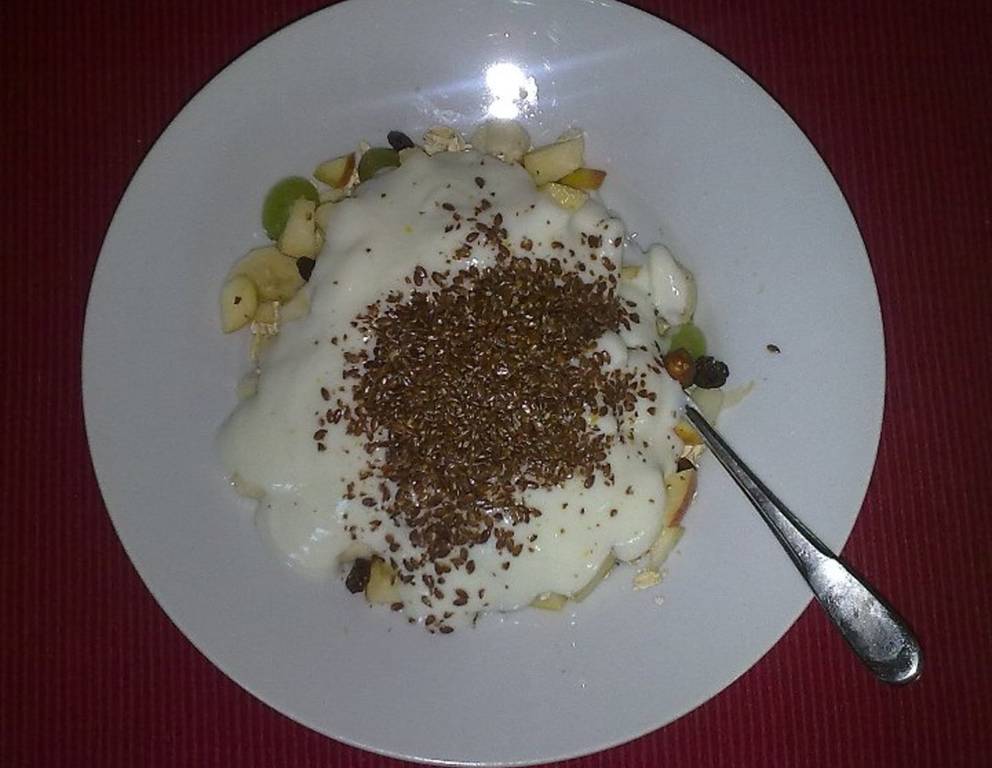 - Das Obst in eine Schale geben und mit den Haferflocken vermischen. Auf Teller füllen und den Joghurt darauf verteilen. Auf jede Portion je einen EL geschrotete Leinsaat geben.