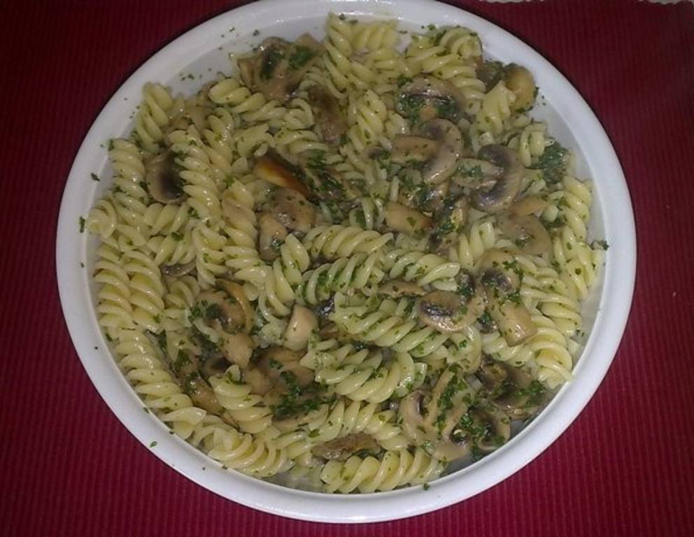 Die Fusilli mit Champignon-Petersil-Soße mit frisch gehobeltem Parmesan bestreuen. Auch geröstete Pinienkerne passen sehr gut.