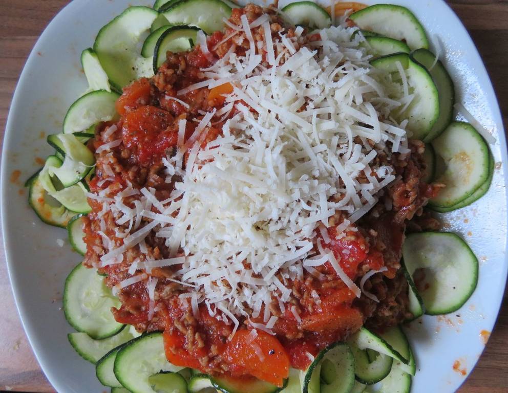- Die Zucchini waschen und mit dem Spiralschneider in „Bandnudeln“ schneiden, kurz in einer heißen Pfanne mit etwas Olivenöl schwenken, danach auf Teller verteilen und mit der Bolognesesauce und frisch geriebenem Parmesan bestreut servieren.